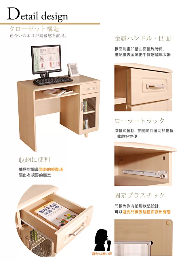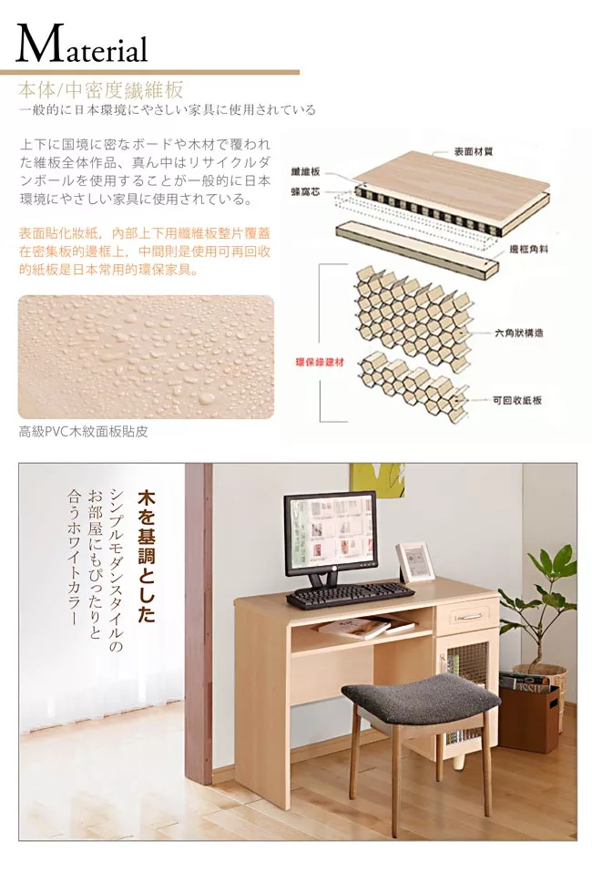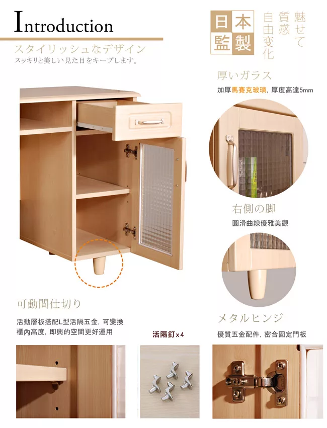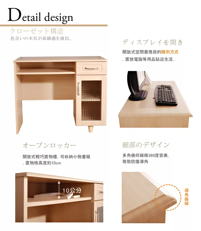 桌面無銳角安全設計,櫃面是蜂巢板貼高級PVC木紋皮,觸感光滑,表面具防潑水效果,有效保護內在材質,玻璃櫃內層板附排洞依置放不同收藏物品,任意調整層板高度,L型五金穩固側邊與層板,100%穩定不位移,加厚馬賽克厚玻璃風格玻璃透光且防潮,搭配復古風格的金屬把手,質感醇厚大器,抽屜門片矩形凹槽設計具層次立體感,配後背板使整體結構更為穩固,木質感融合整體居家更潮。外表光滑看不到螺絲,細微處也注重美感;使用消音棉及軟墊,實木腳附軟墊保護地板,貼心降低關門噪音與避免關門時碰撞的風險,在細節處處用心,附抽屜可收納各類文具用品、小物..等,玻璃櫃內收納各類書籍及資料夾、..等。嚴選頂級五金絞鏈,經非常多次的開合也不易鬆脫,底面附絨布防刮墊保護地板。